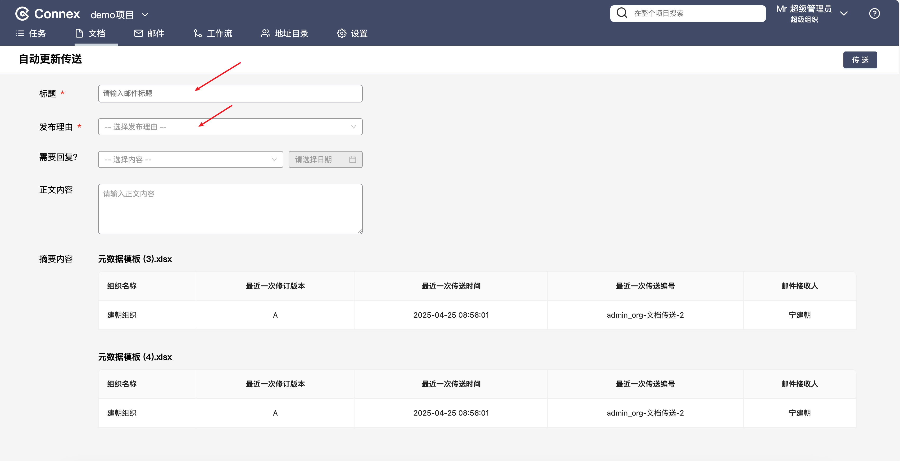 您需要对其他组织进行一些文档的传送,若您不知道怎么操作,请搜索“传送文档”