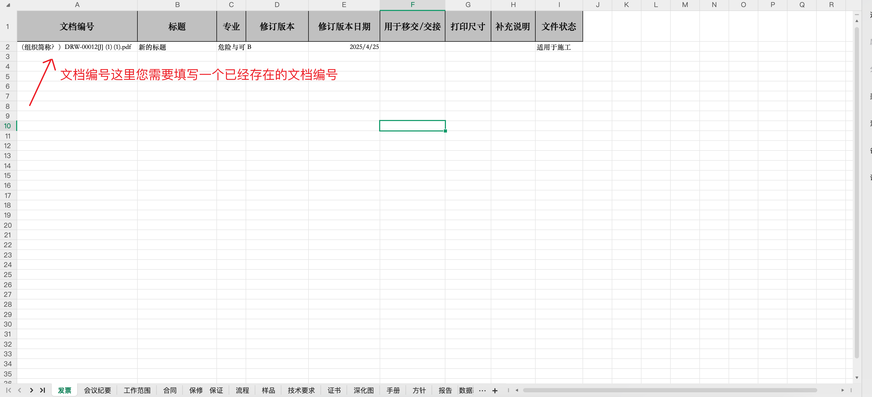 1. 模版文档中,“文档编号”那一列必须填写是组织在当前项目内已存在的文档编号。