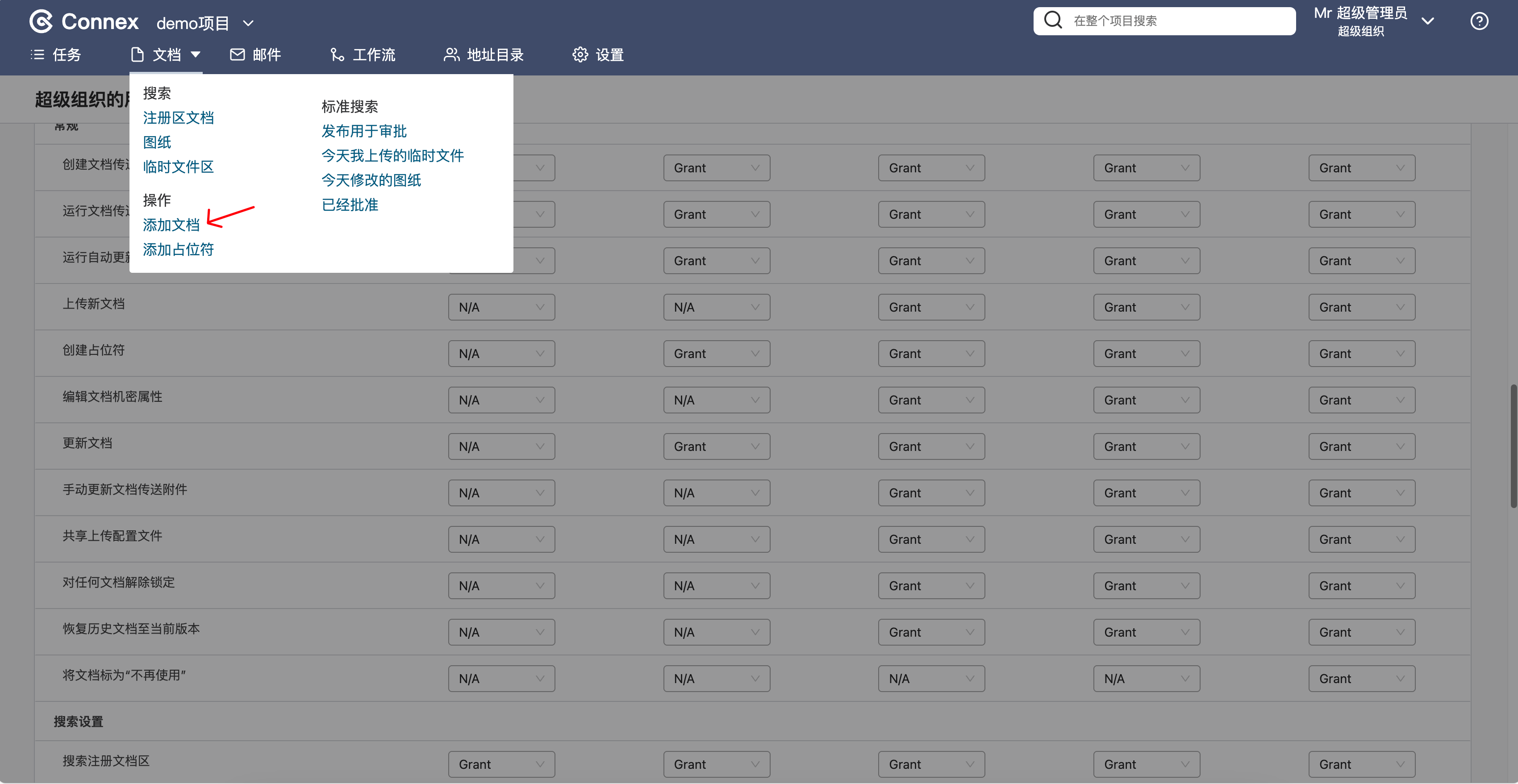在Connex的文档模块中上传文档,您的账号需要拥有以下权限: