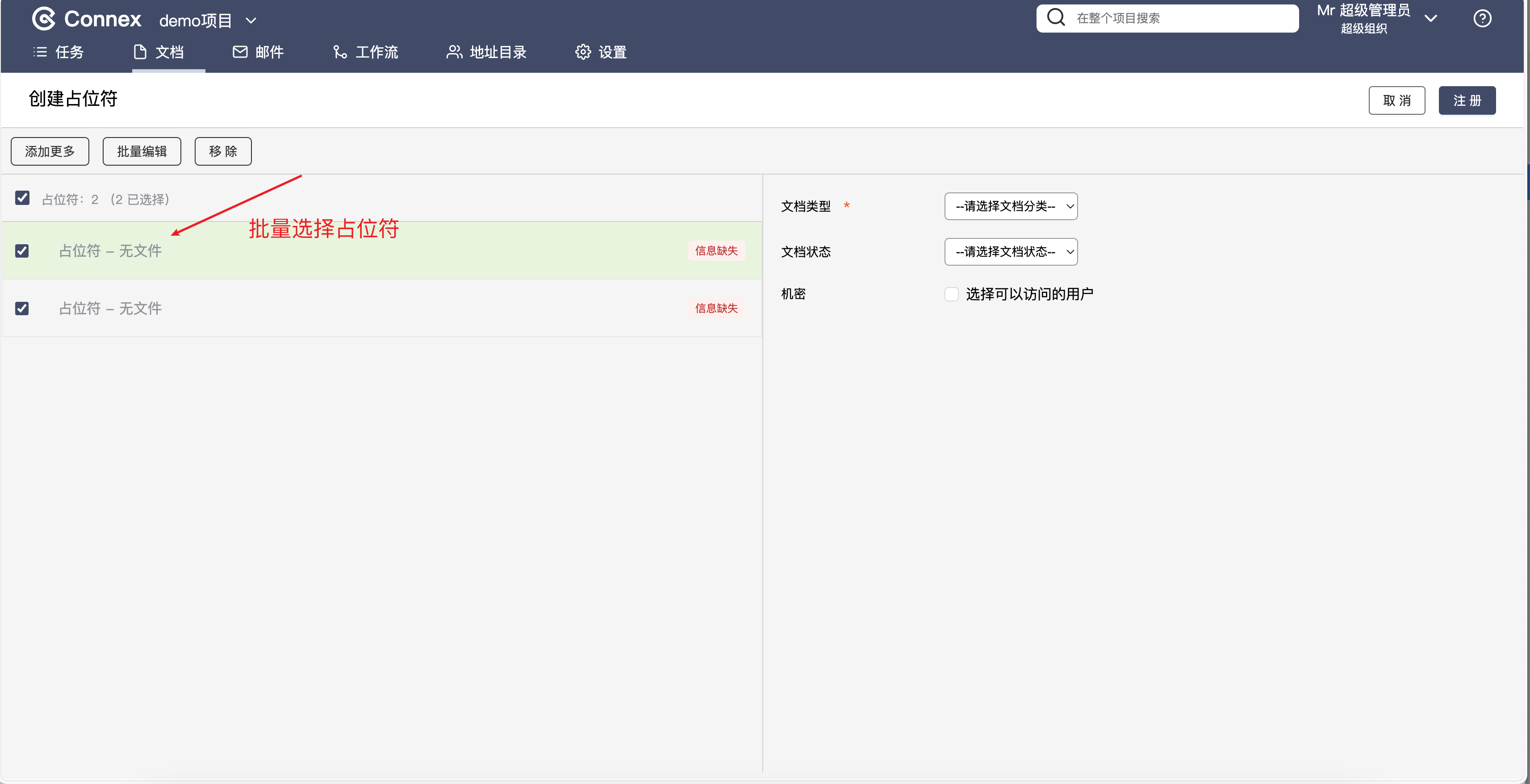 创建占位符1. 首先,点击导航栏的“文档“,然后点击”添加占位符“