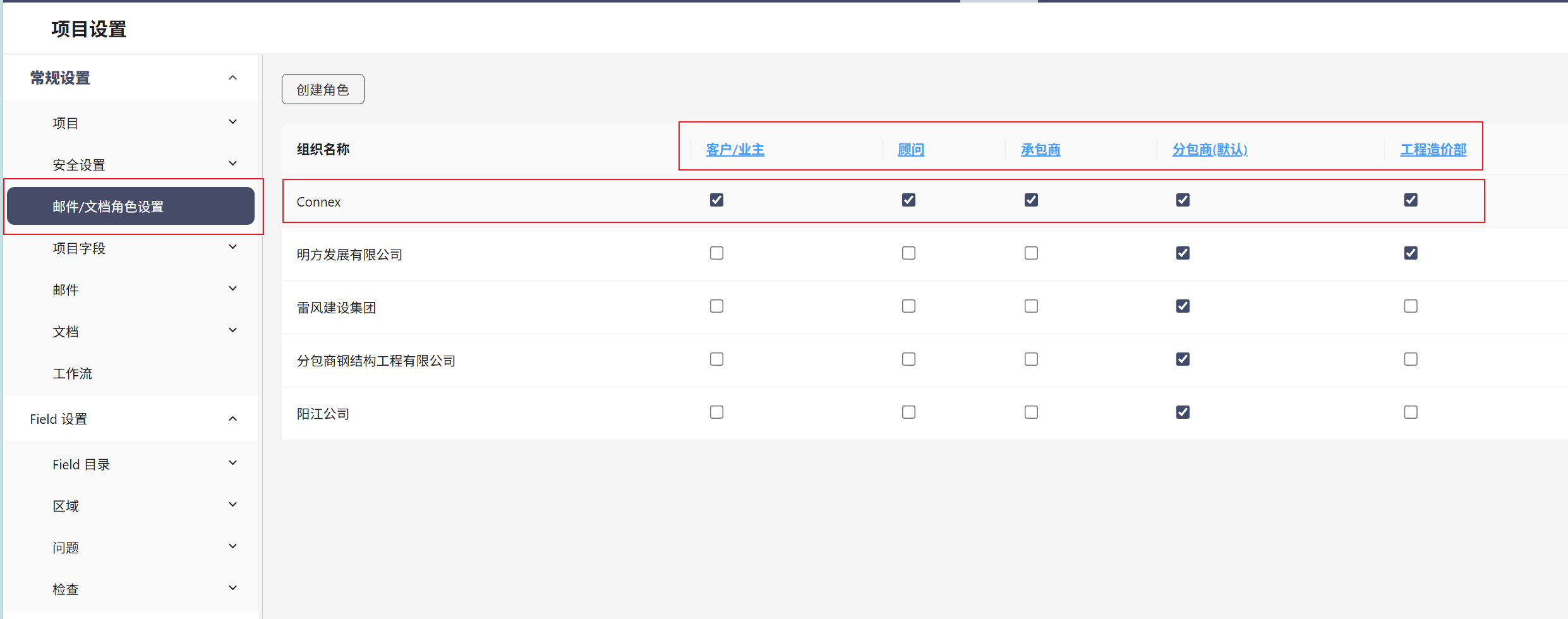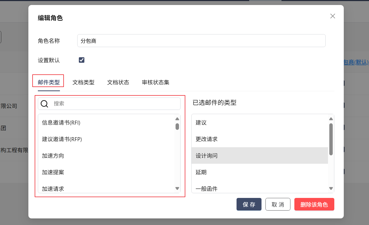 - 编辑项目设置项目角色确保每个组织仅有权使用特定于其作业的类型和状态。这意味着他们不会意外使用错误的邮件或文档类型。