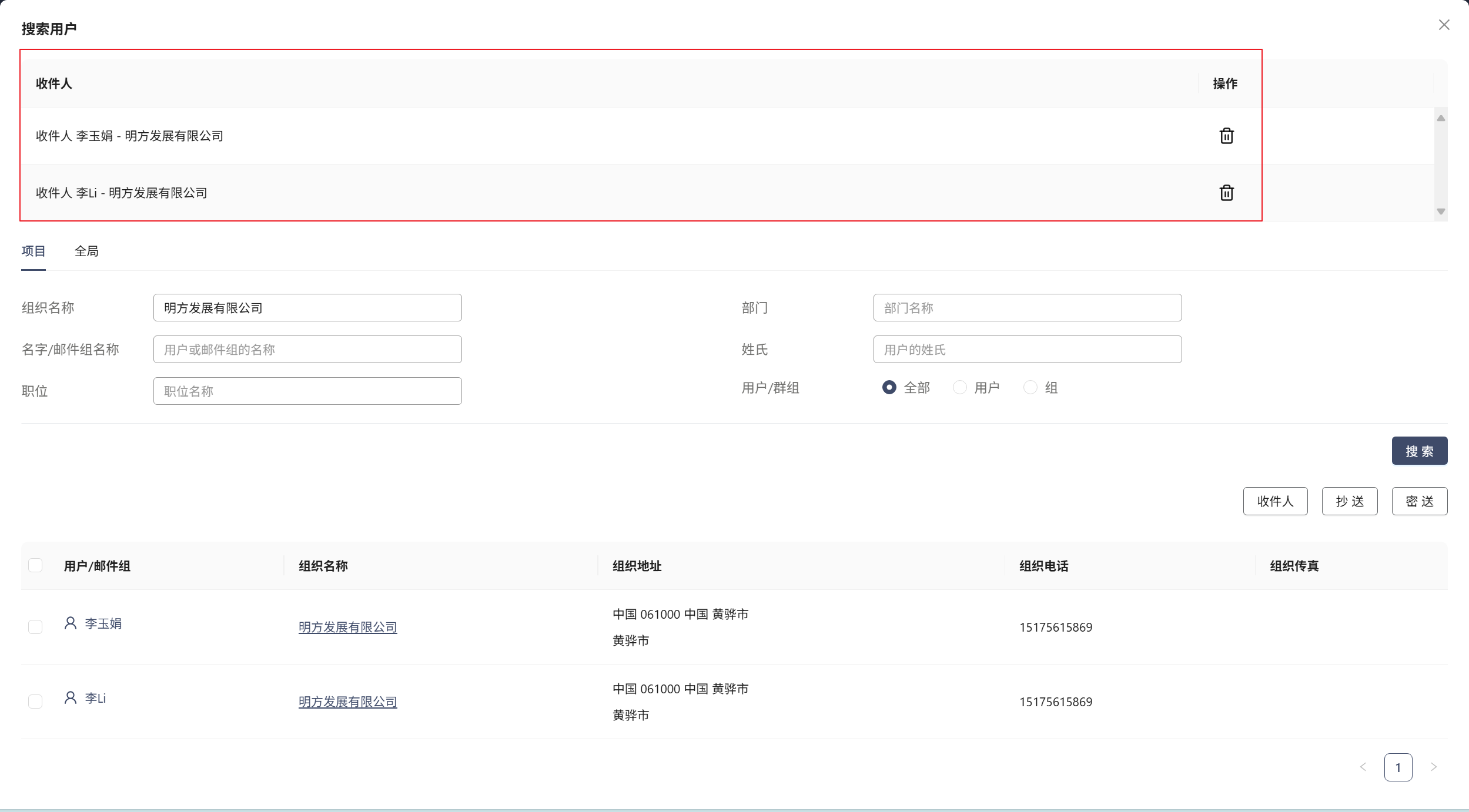 - 点击搜索按钮。结果显示在搜索字段下方。有了结果列表后,您就可以使用收件人,抄送和密送选项一次添加多个收件人。
