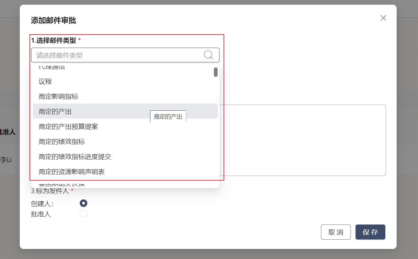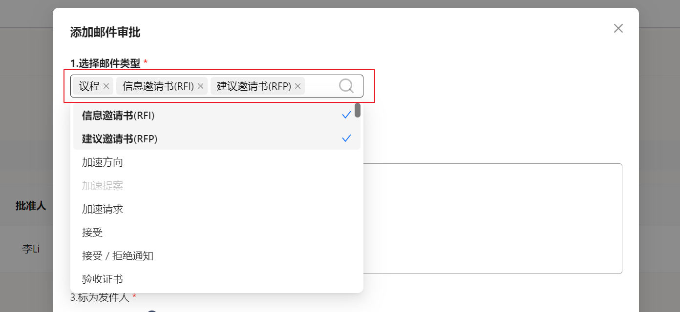 - 它将覆盖为所选邮件类型设置的任何组织级别审批规则。您必须具有为项目配置邮件审批的权限。- 从 选择邮件类型 列表中选择要配置的邮件类型。