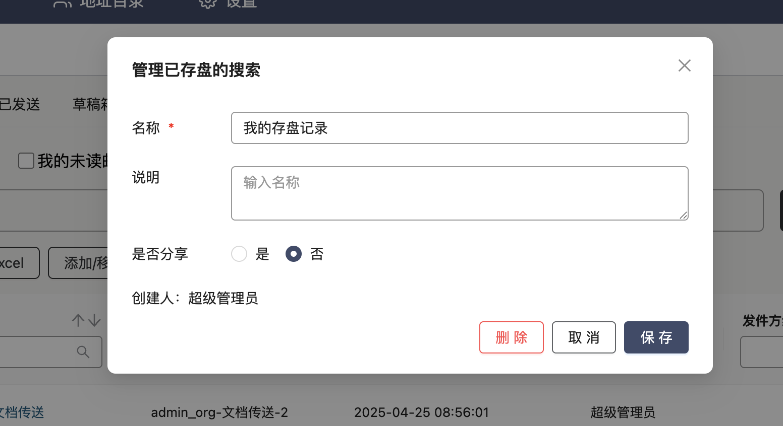 若要共享您自己的已存盘的搜索设置,您的账号需要具备以下权限