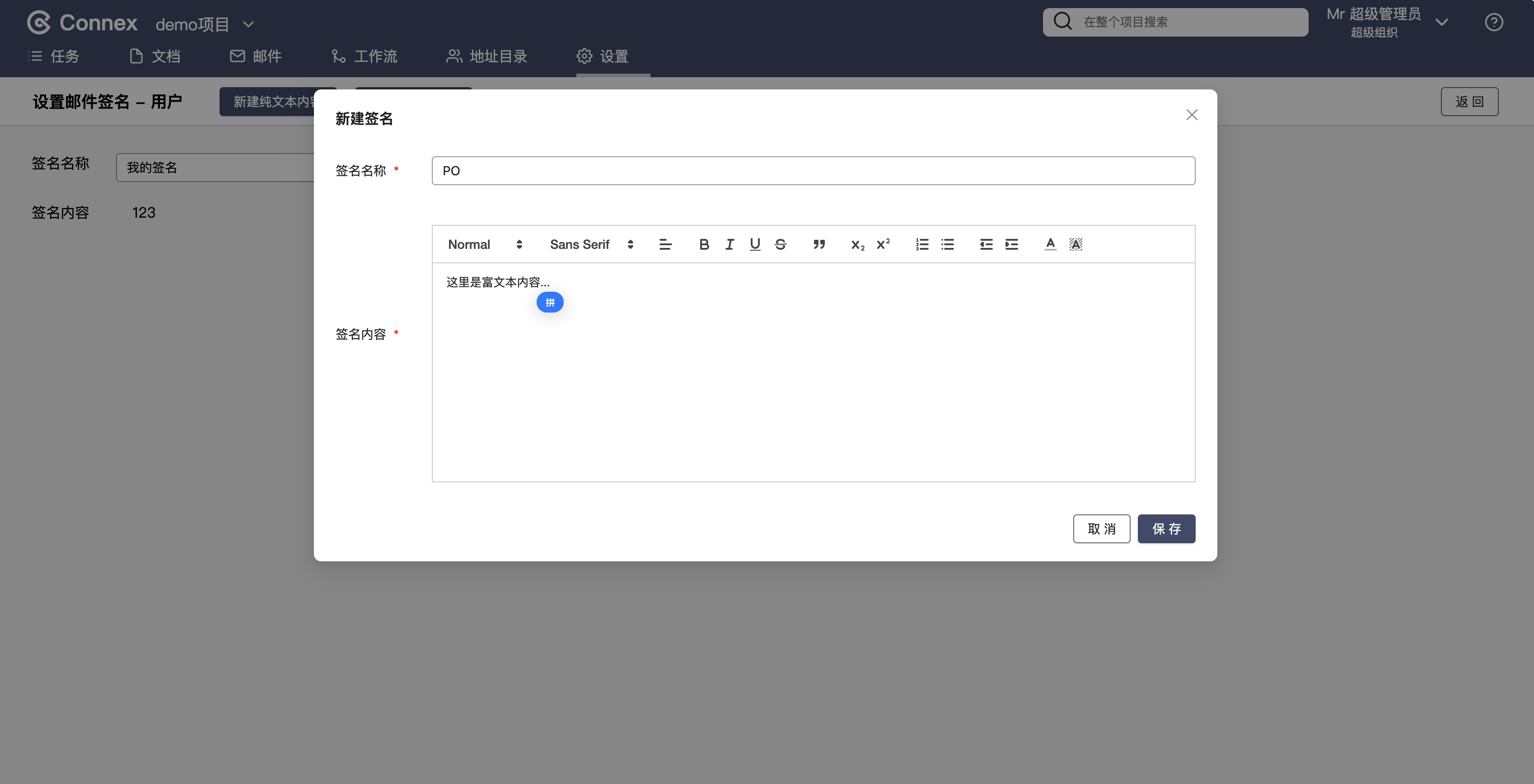 创建新签名和编辑现有签名操作均位于相同的地方–在“个人设置/邮件”中的“配置邮件签名”中