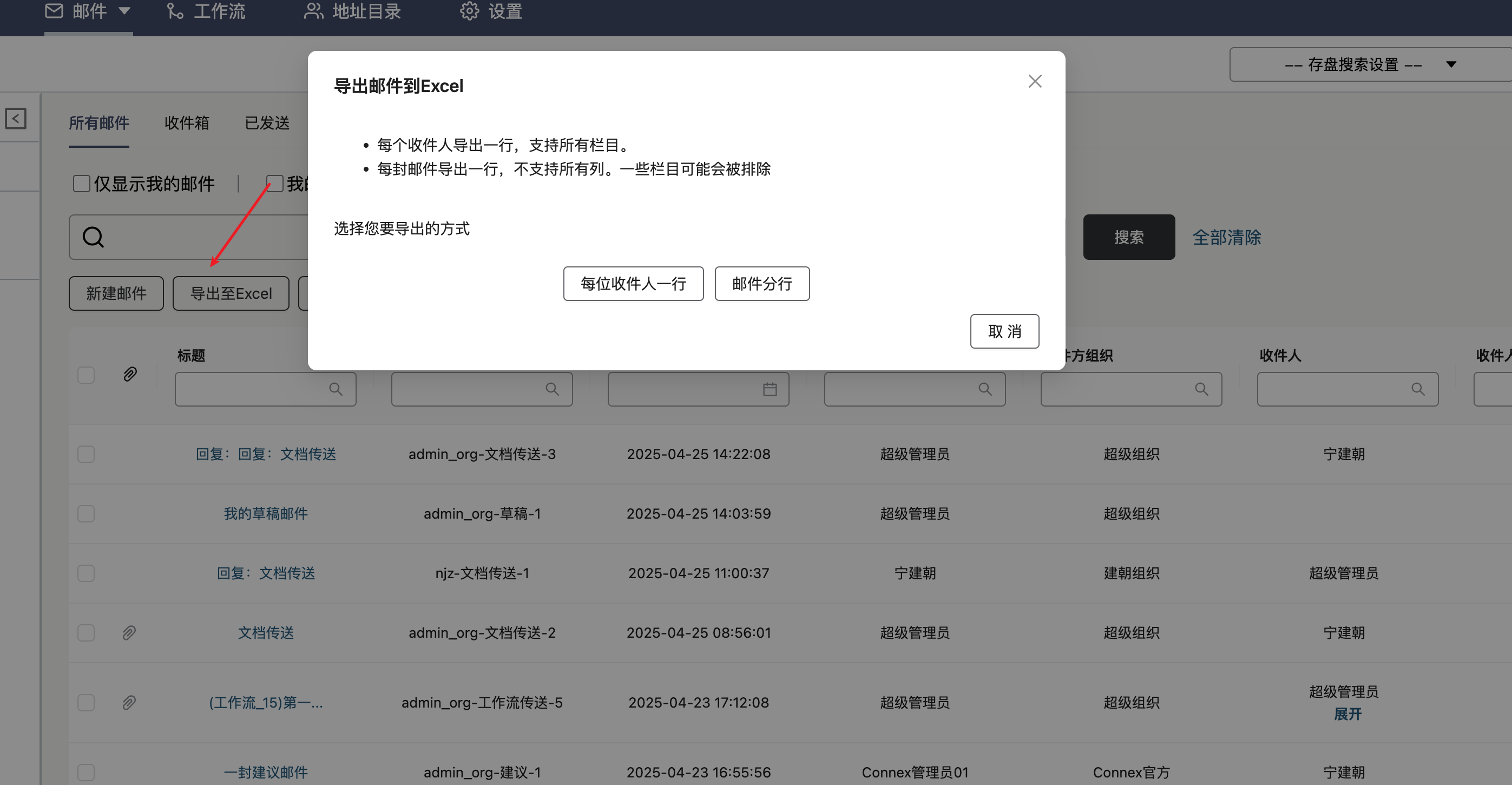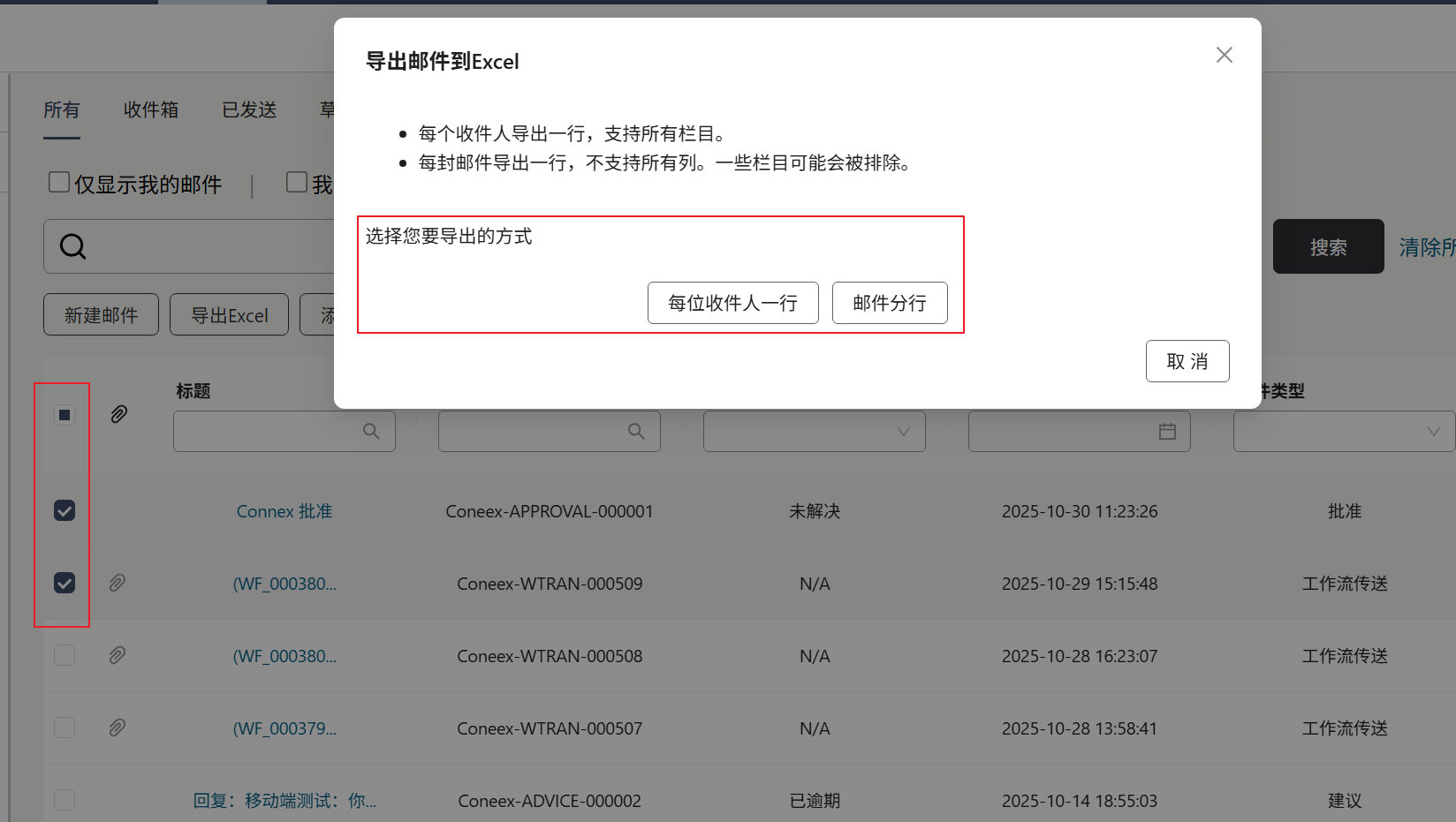 - 取消选中所有邮件以导出所有搜索结果。- 单击报告, 然后选择导出到 Excel。