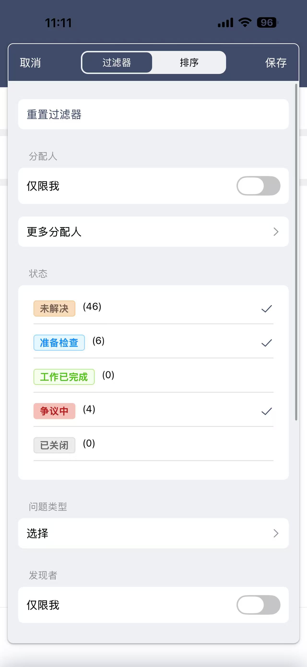 - 状态 – 允许您根据问题的状态筛选问题。您可以选择 "未解决", " 工作已完成"," 准备检查", "争议中" 或 "已关闭"的任意或组合。
