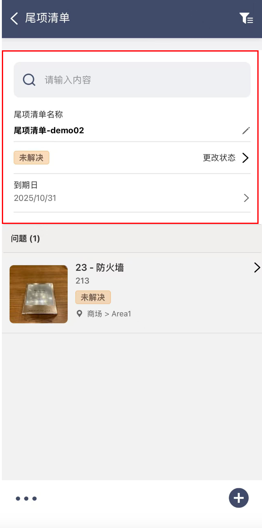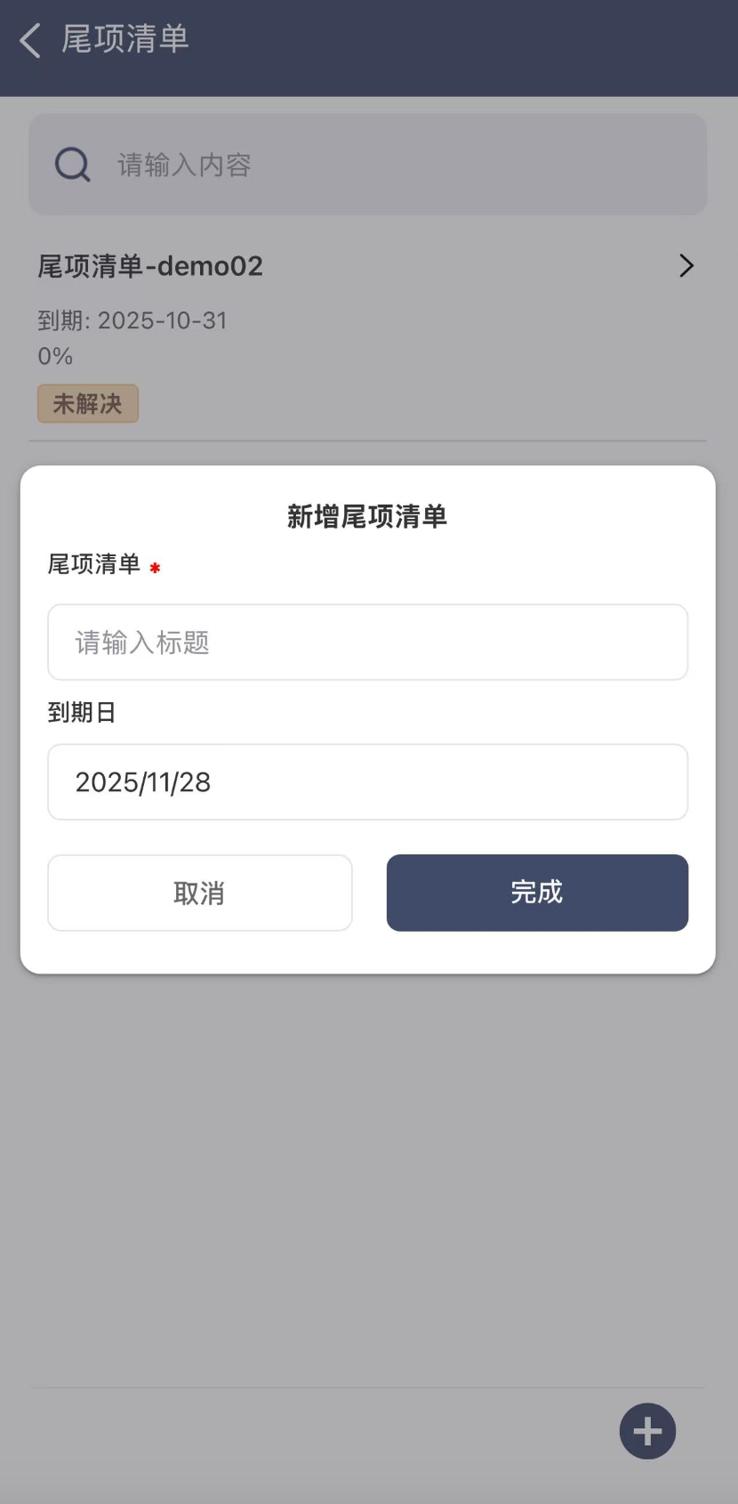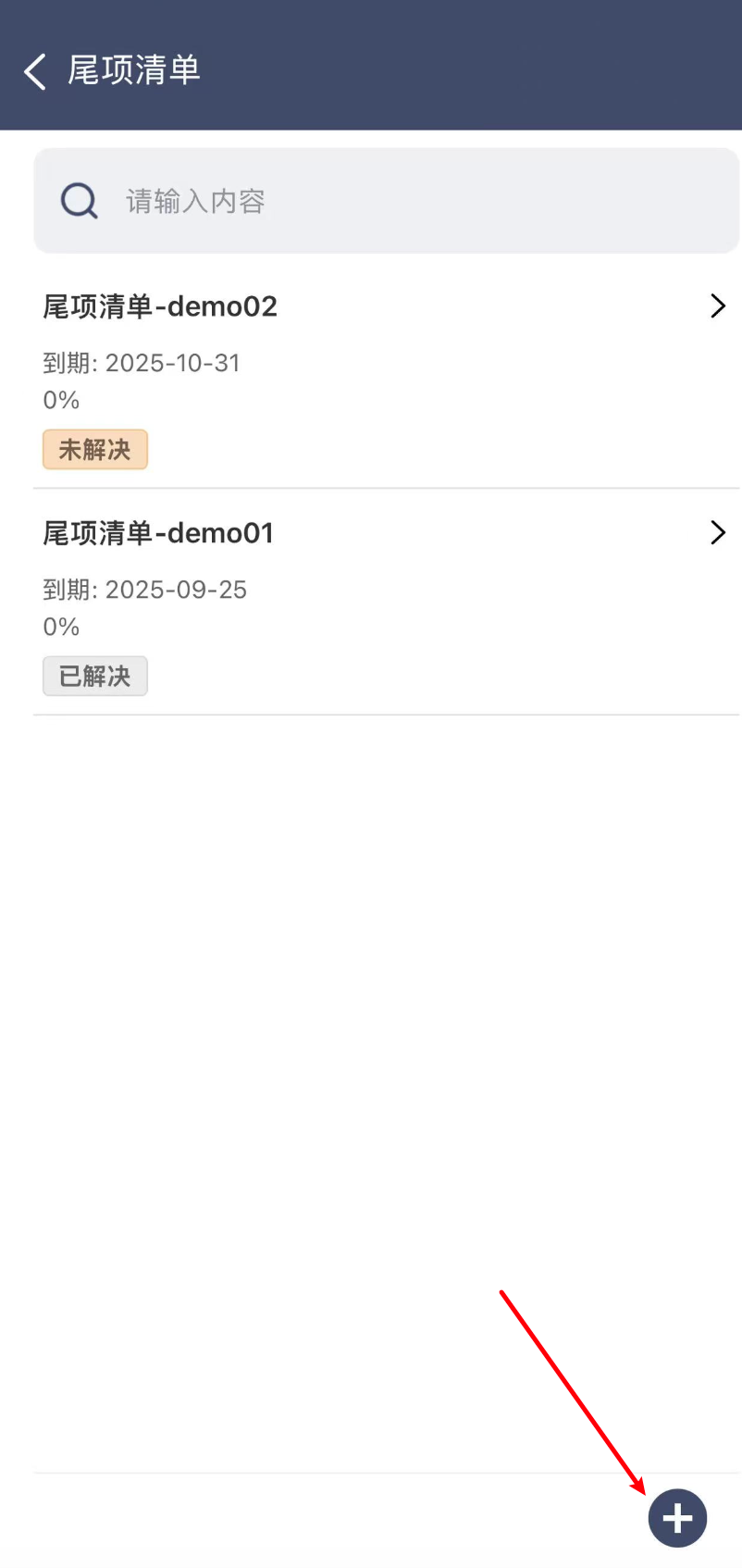 在尾项清单模块的首页,会展示您的组织当前创建的尾项清单列表,点击页面右下角的“+”按钮,可创建尾项清单