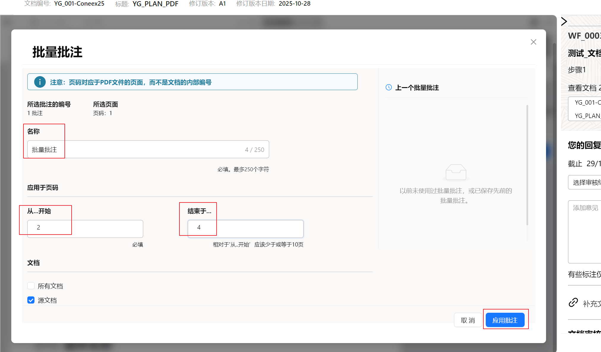 在批量批注屏幕中完成详细信息: