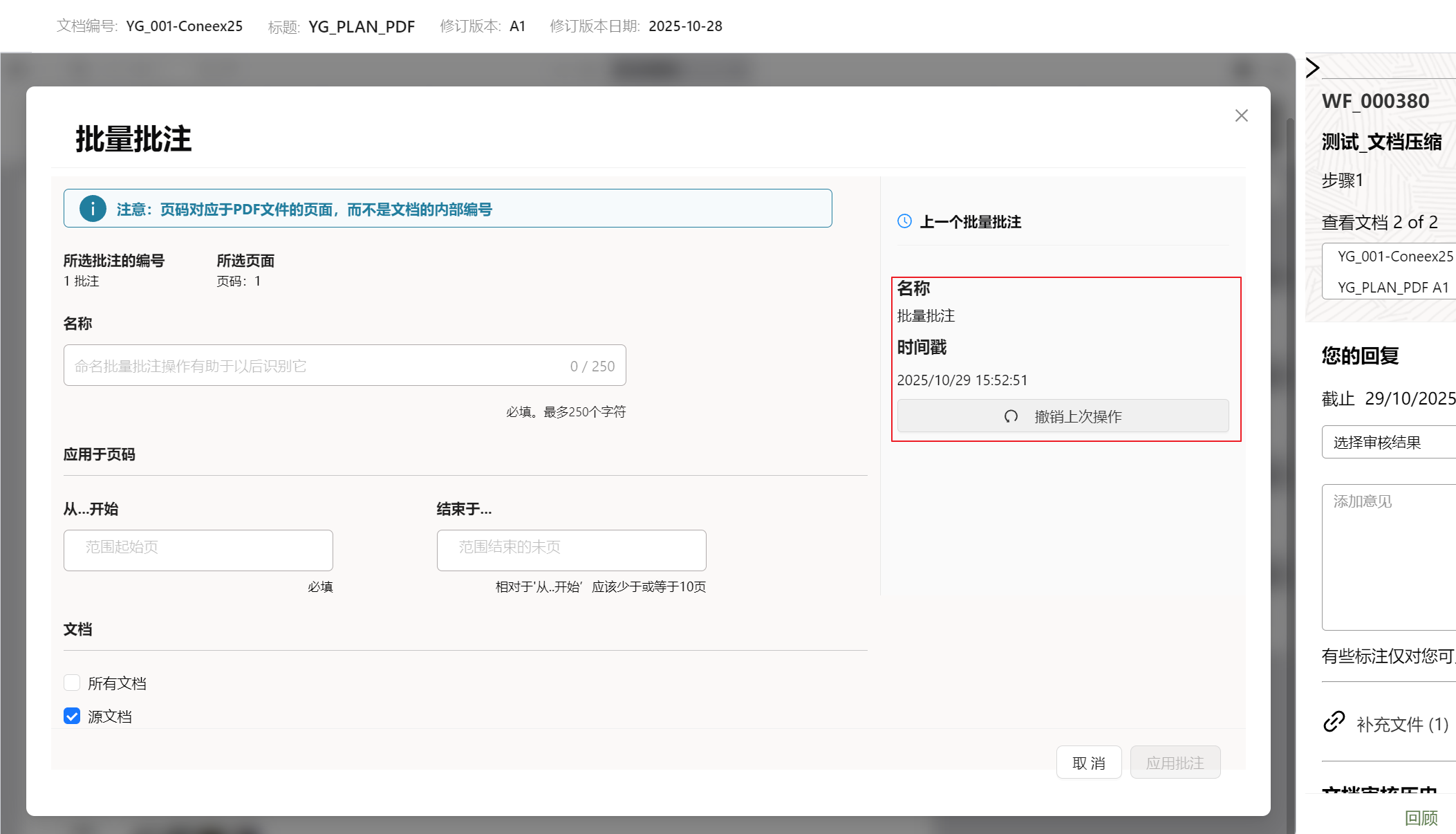 - (可选)如果犯了错误,可以撤消上次应用的批量批注。单击批量批注, 然后选择撤消上一个批注操作 。