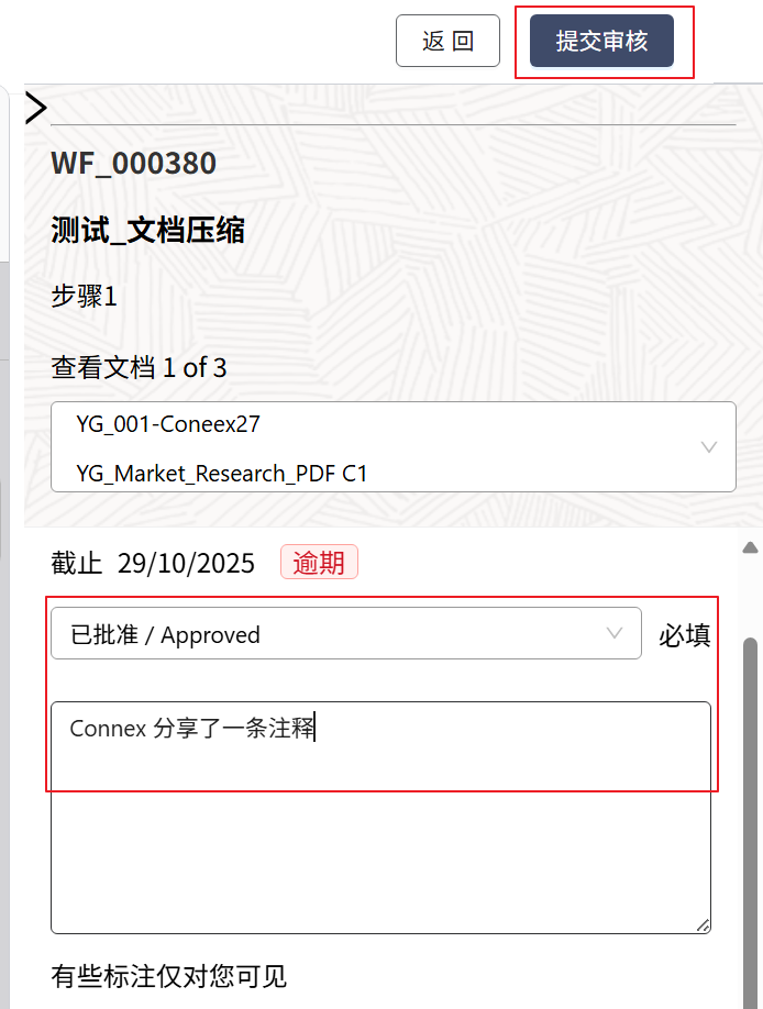 - 如果您为任何文档输入了审批结果或评论,您将在此处看到它们。您也可以从此屏幕进行更改。