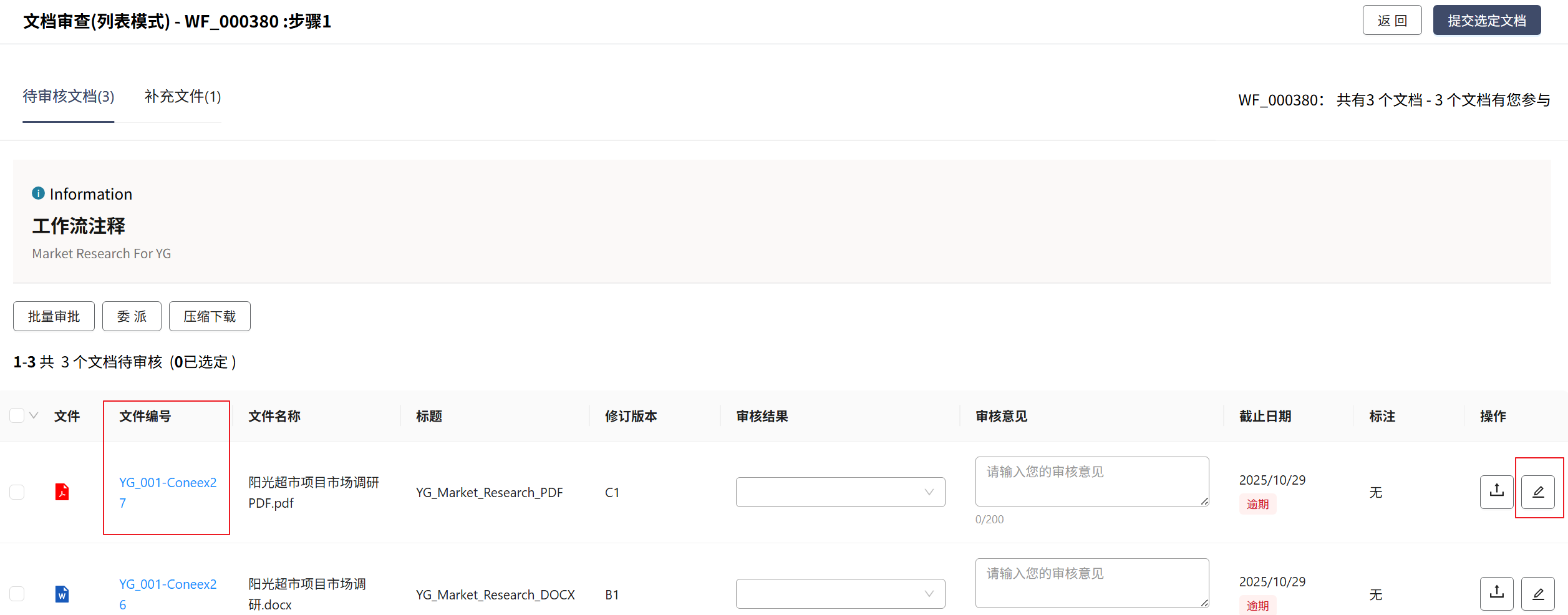 - 单击文档编号或标记图标(铅笔图标)以文档模式打开文档,您可以在其中查看文档并添加标记。