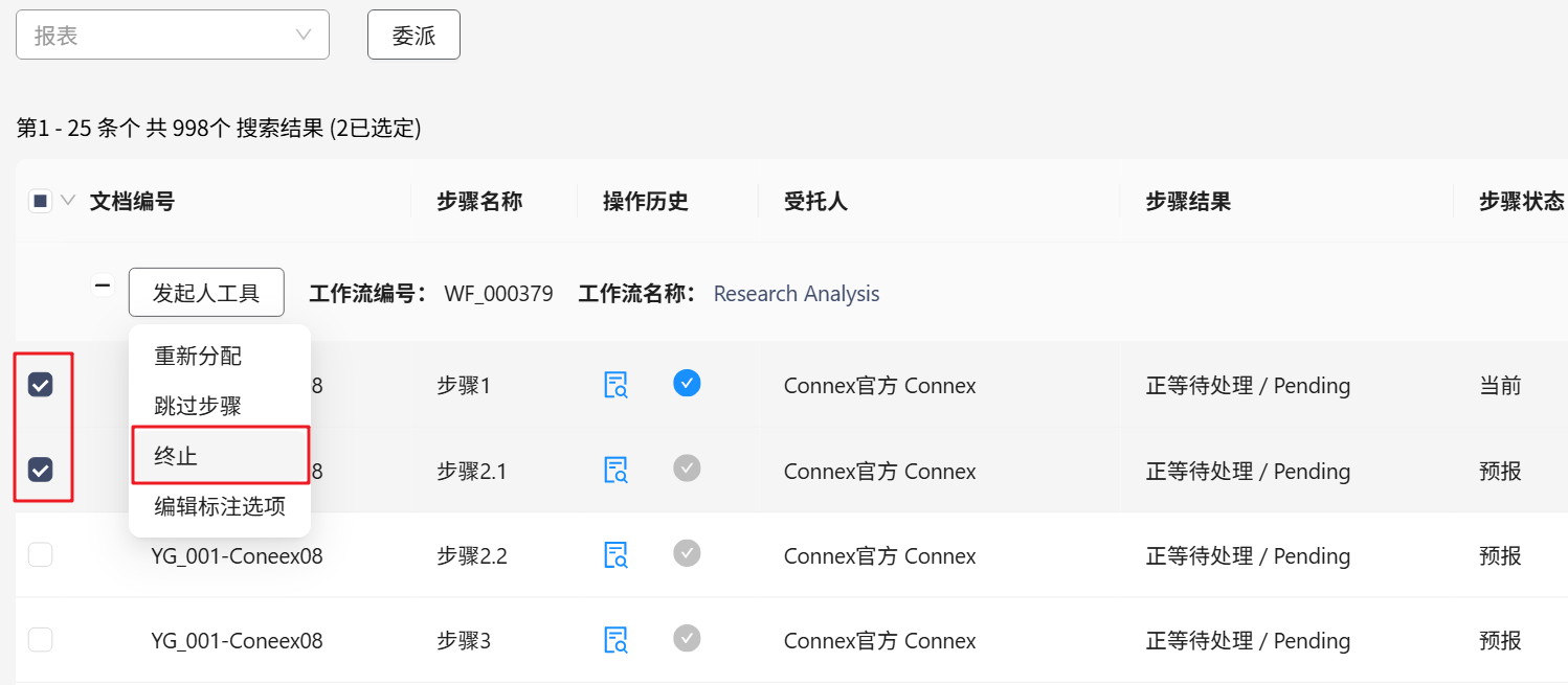 提示: 从工作流中终止文档不会将其从文档注册区中删除。