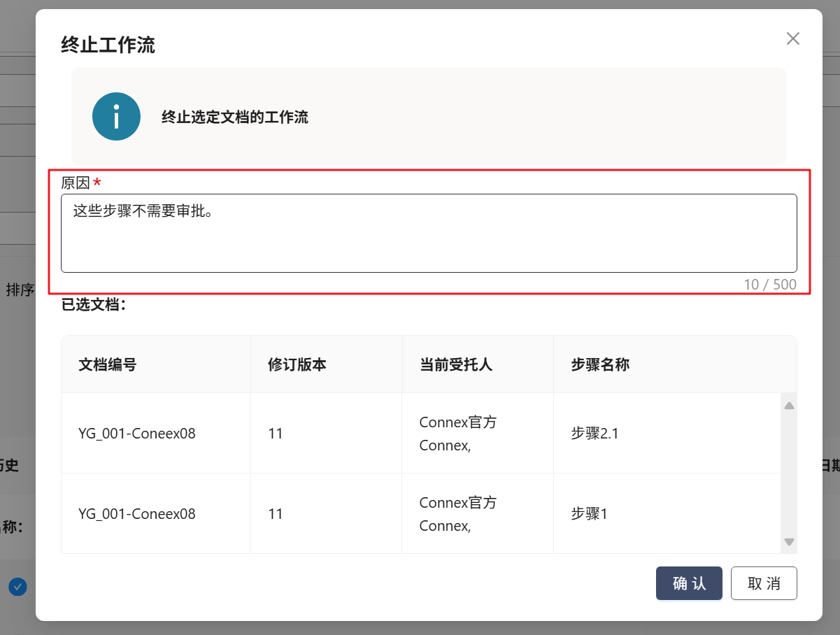 将显示一个确认窗口。检查列出的文件是否是您要终止的文件,并输入终止它们的原因。
